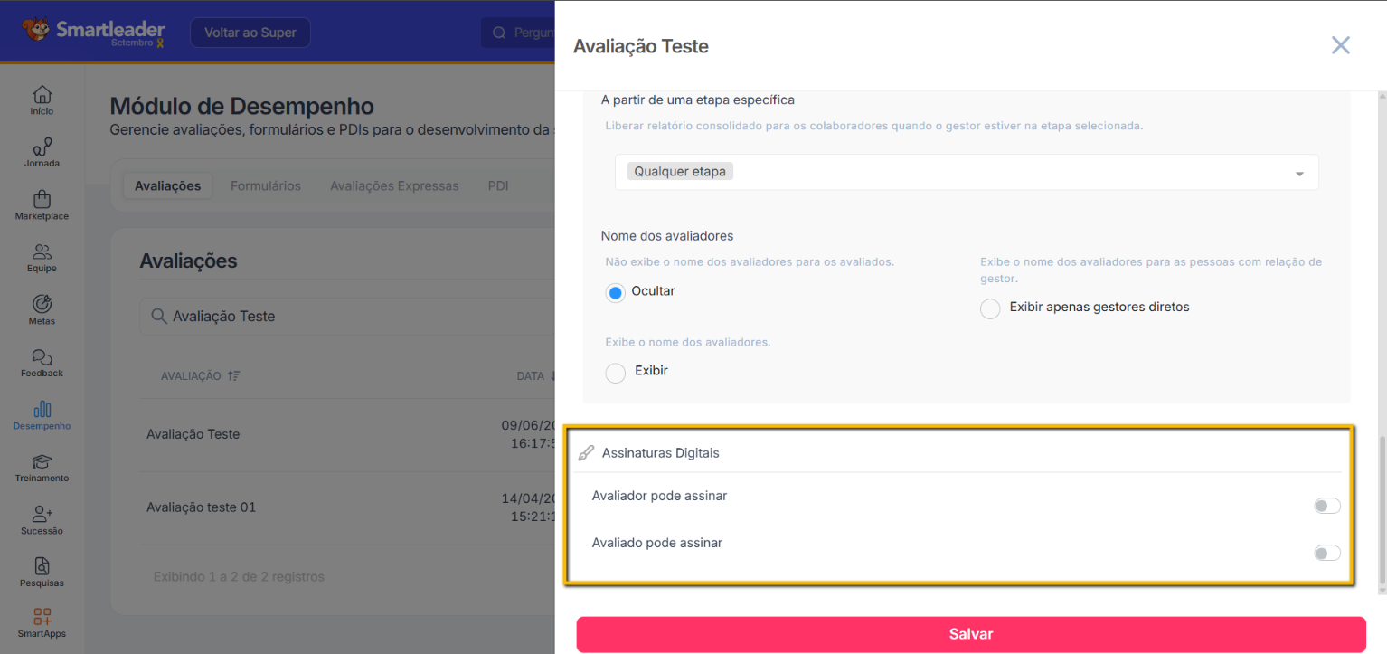 Ao realizar uma avaliação, é possível ativar a opção da assinatura digital do avaliador e/ou avaliado, nos relatórios individuais ou consolidado. Esse processo traz ainda mais segurança e integridade ao seu processo avaliativo. Bacana né?