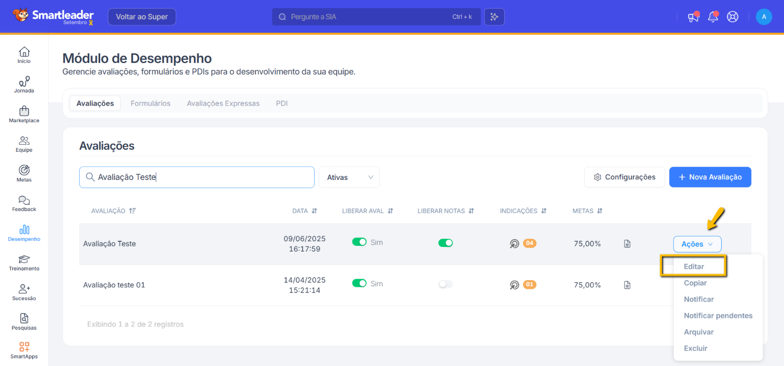 1 - No módulo "Desempenho" busque a avaliação que deseja liberar a funcionalidade. No exemplo abaixo, vamos usar como modelo a "Avaliação Teste":