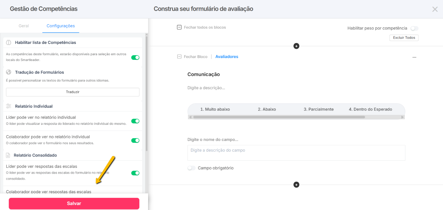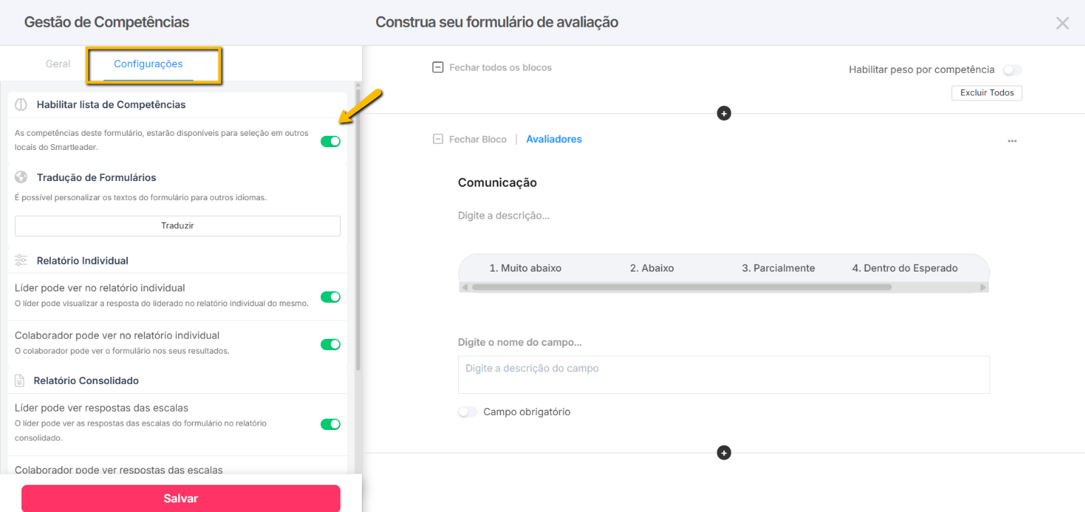 Para encontrar a chave que habilita e desabilita esta funcionalidade, abra o formulário e clique na aba "Configurações". Com o botão ligado, todas as competências do formulário serão exibidas nestes outros locais do sistema.
