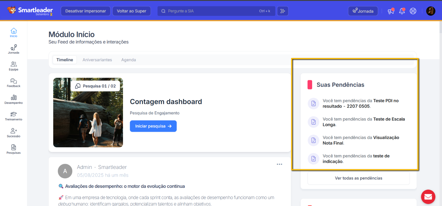 Primeiro: quando você acessa no Smartleader e a avaliação ainda estiver liberada, você poderá consultar suas pendências no canto direito da sua tela. As pendências aparecem quando a avaliação está ativa, com pendências e dentro do prazo para conclusão.
