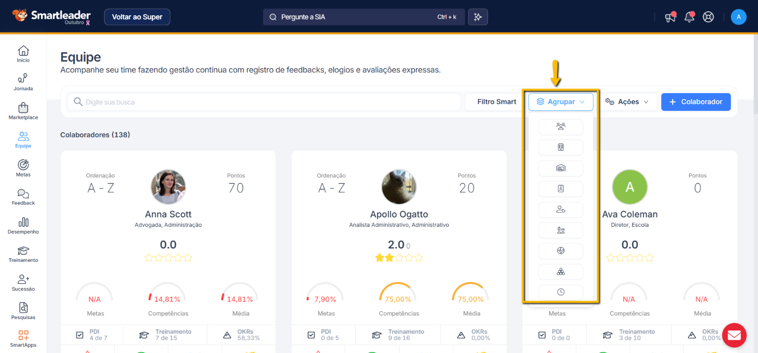 Os agrupamentos somam as quantidades de colaboradores naquele critério, exibindo a soma total de feedbacks e de pontos, além da a média de metas, competências, média e avaliação expressa.