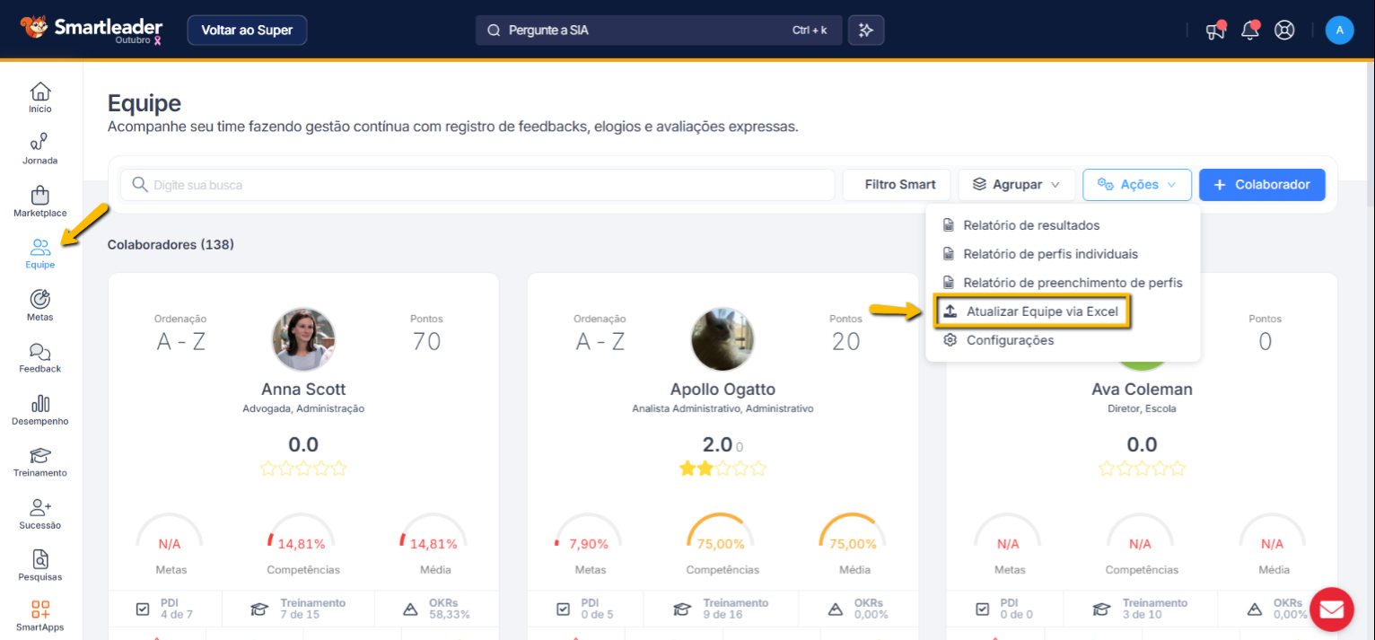 - A planilha modelo, (obrigatória para o posterior upload no sistema) , está disponível no módulo "Equipe" através do botão "Ações" e "Atualizar Equipe via Excel"