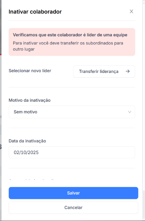 Note que o caso acima era de um líder, então antes da inativação é necessário clicar em Transferir Liderança para um novo líder: