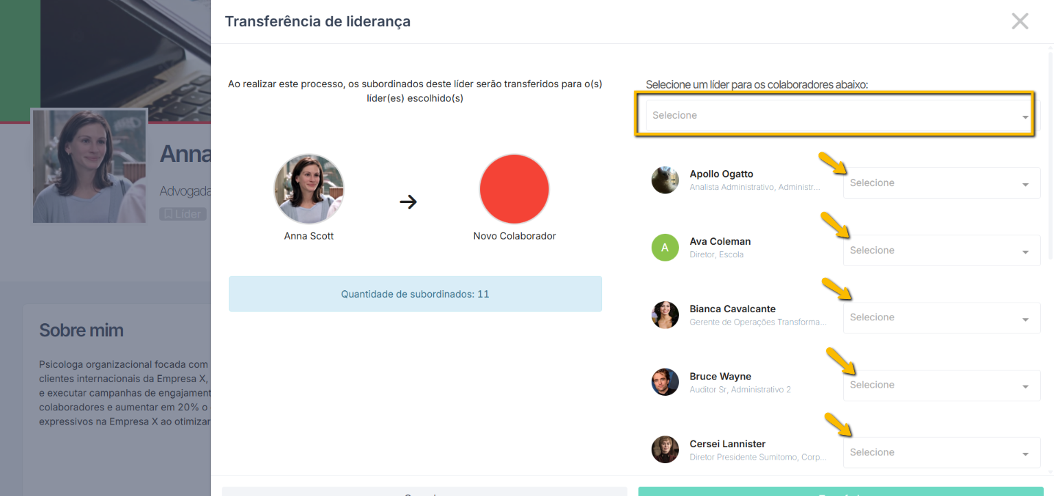 Sendo possível selecionar um líder para transferência massiva, ou, selecionar um Líder para cada um dos colaboradores.