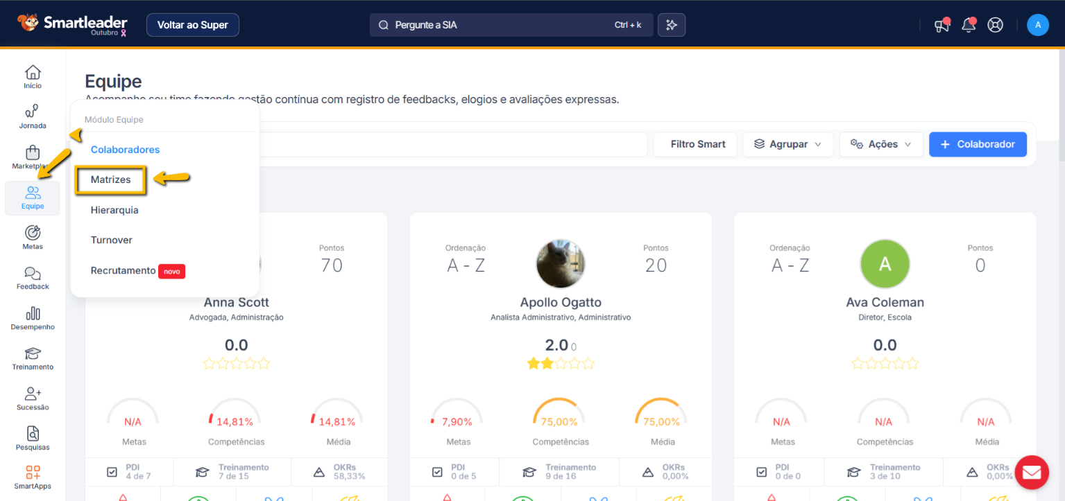 Desta forma, o primeiro passo é ir até a matriz que deseja calibrar, a qual pode ser encontrada no módulo Equipe. Passe o mouse por cima do Modulo Equipe e clique no botão "Matrizes".