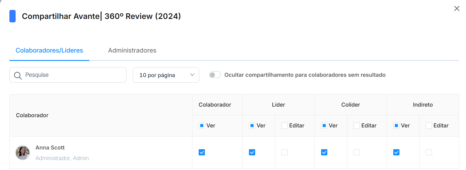 Na nova tela, note que é possível compartilhar a matriz com líderes, colaboradores e/ou com administradores. Neste artigo, vamos falar somente do compartilhamento com Administradores.