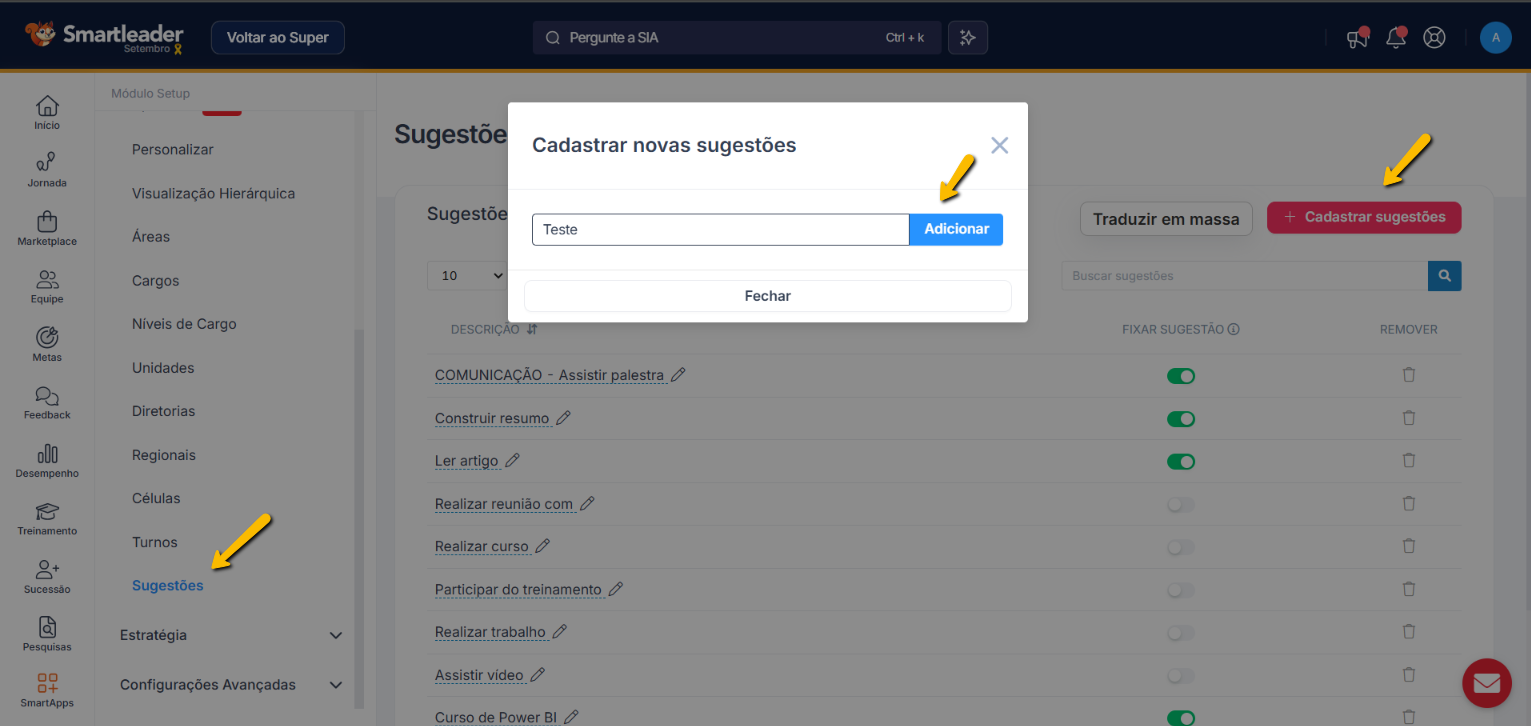 Feito isso, as inclusões irão refletir nos locais em que temos os PDIs, como no exemplo abaixo que mostra o PDI no módulo Desempenho e a lista que criamos no módulo Configurações > Sugestões: