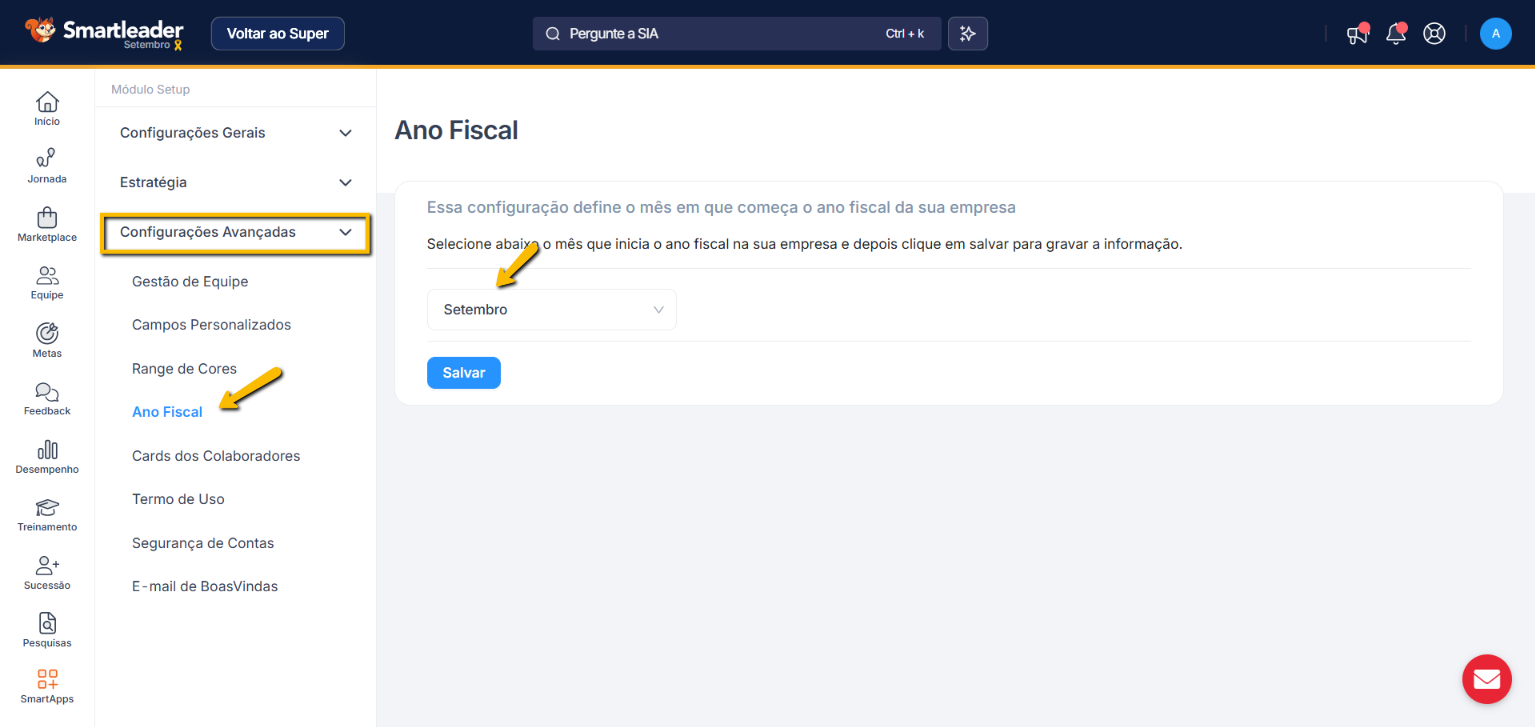 Basta selecionar o mês em que começa o ano fiscal da sua empresa e clicar em "Salvar" para configurá-lo.