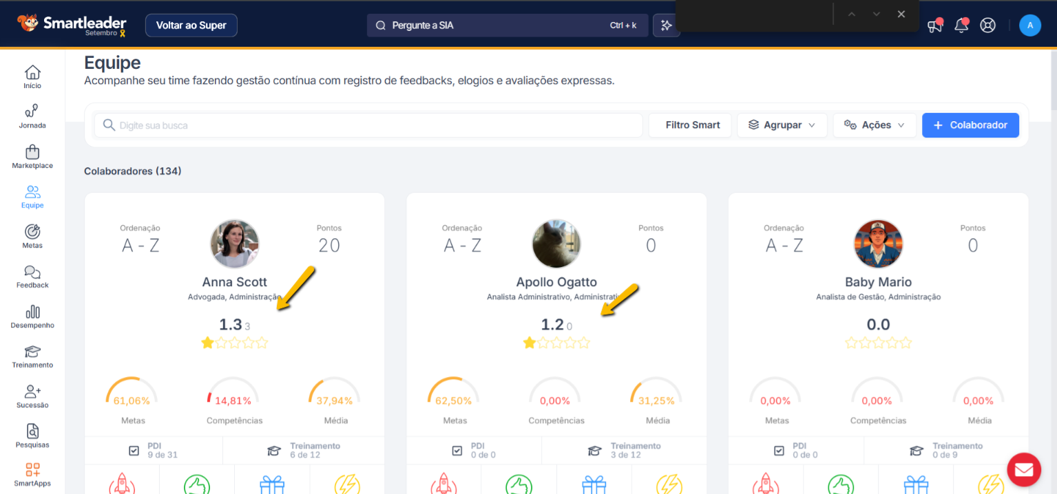 Uma outra forma de visualizar o resultado final do colaborador (indicador de média no card e média global no perfil) é por meio das estrelas do colaborador. Quanto mais perto das 5 estrelas preenchidas, melhor seu resultado. Clique aqui para saber mais sobre o indicador no card do colaborador.