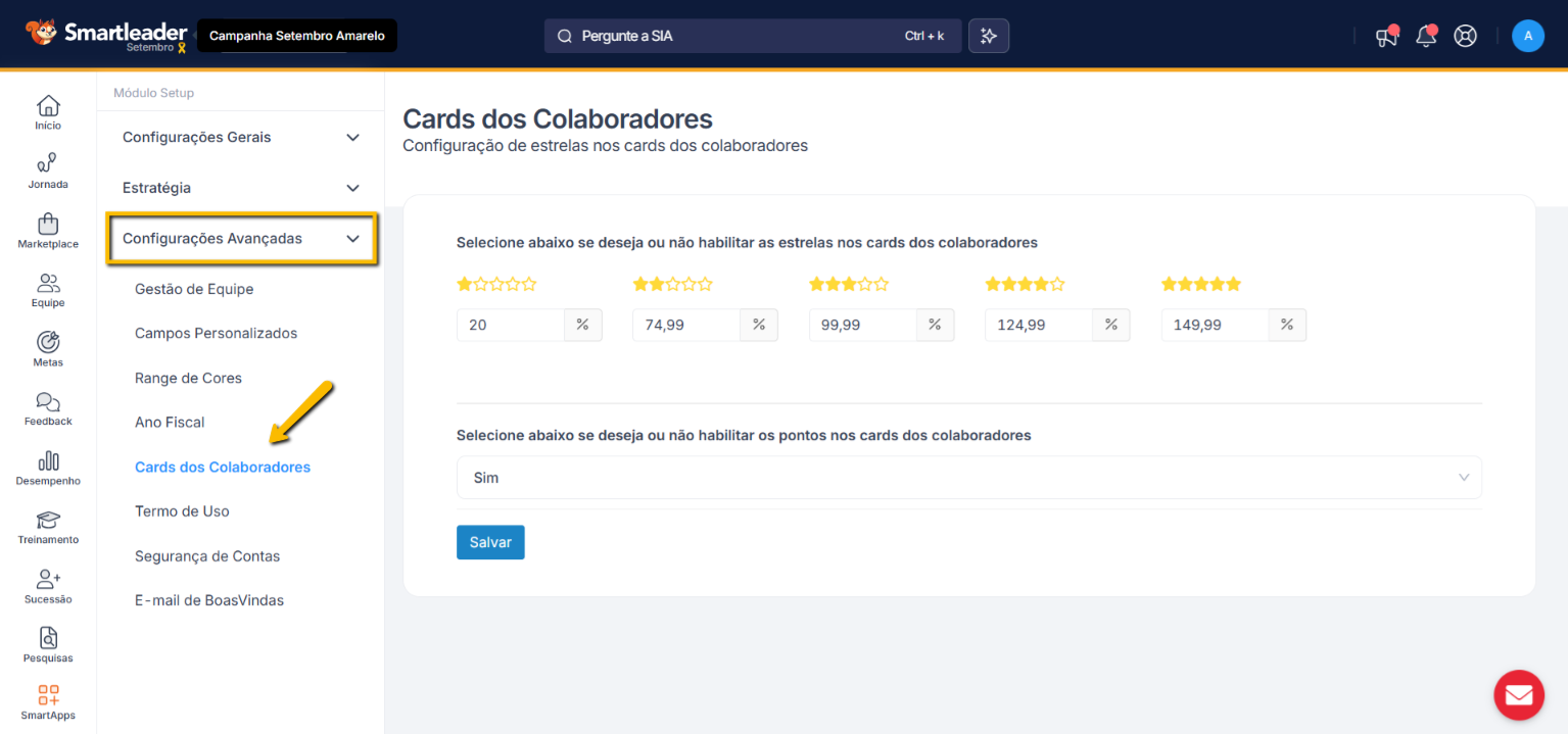 No Setup do cliente, clique no tópico "Estrelas do colaborador" dentro da seção Configurações Avançadas para configurar a exibição das estrelas e suas porcentagens de preenchimento. Siga os passos abaixo: