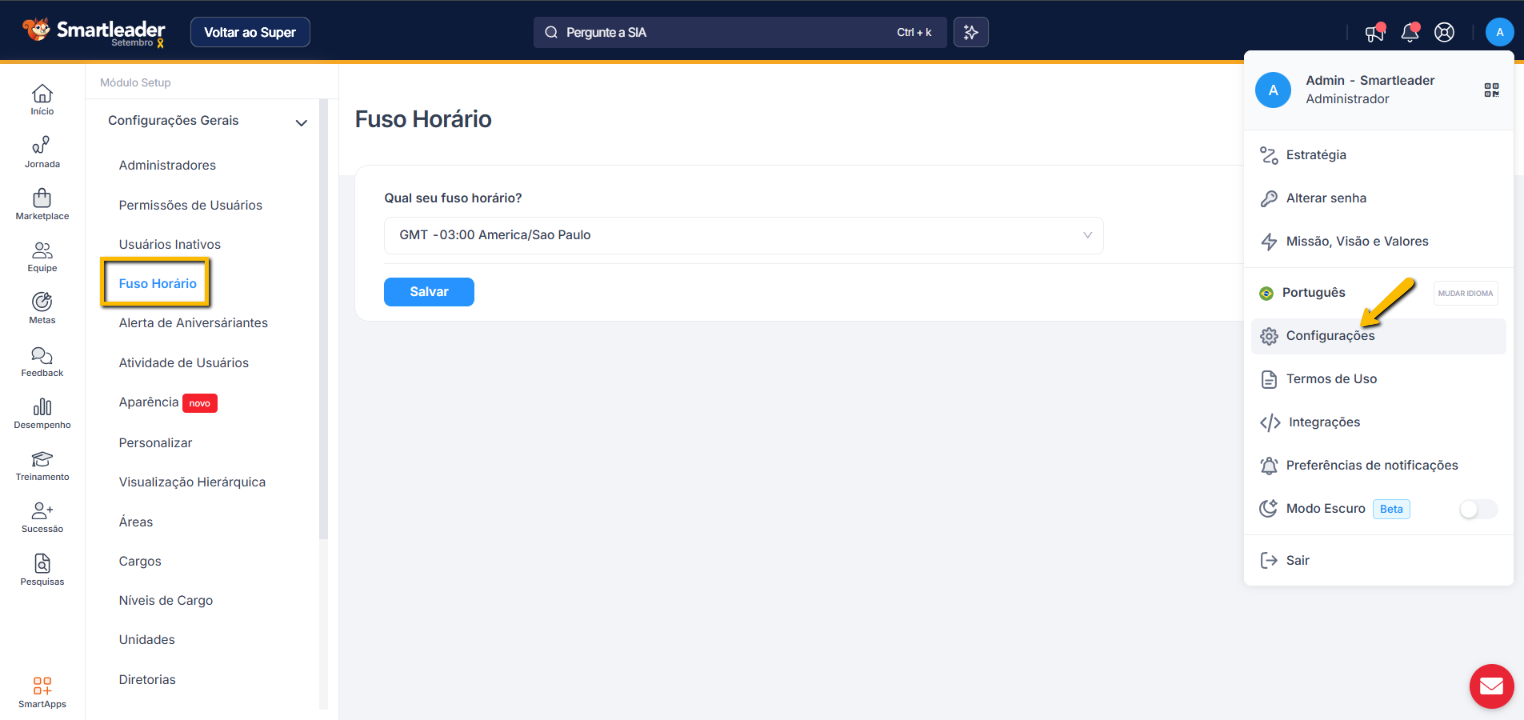 A definição do fuso horário é importante para o envio de notificações, como por exemplo, as notificações de aniversário que o Smartleader envia de forma automática.