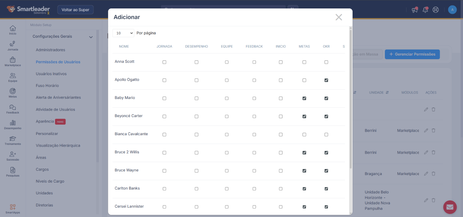 O campo de permissões de usuários define quais colaboradores terão restrições em quais módulos, ou seja, aqui você pode bloquear módulos específicos para conjuntos de colaboradores por diversos critérios, como cargo, área ou unidade.