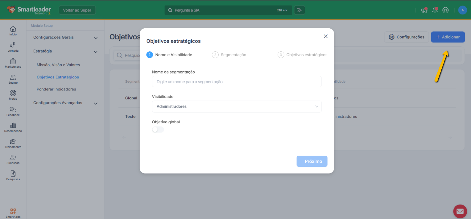 Assim que escolher, você selecionará o grupo que verá as informações: - Clique em Objetivos Estratégicos ou no botão Próximo;