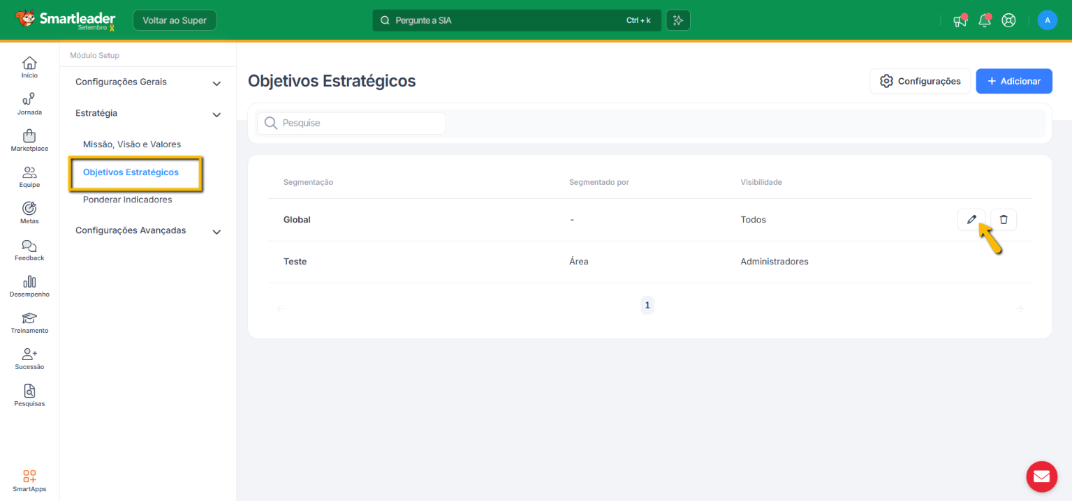 Em Configurações, procure na listagem do lado esquerdo a configuração denominada de Estratégia e clique em Objetivos Estratégicos: