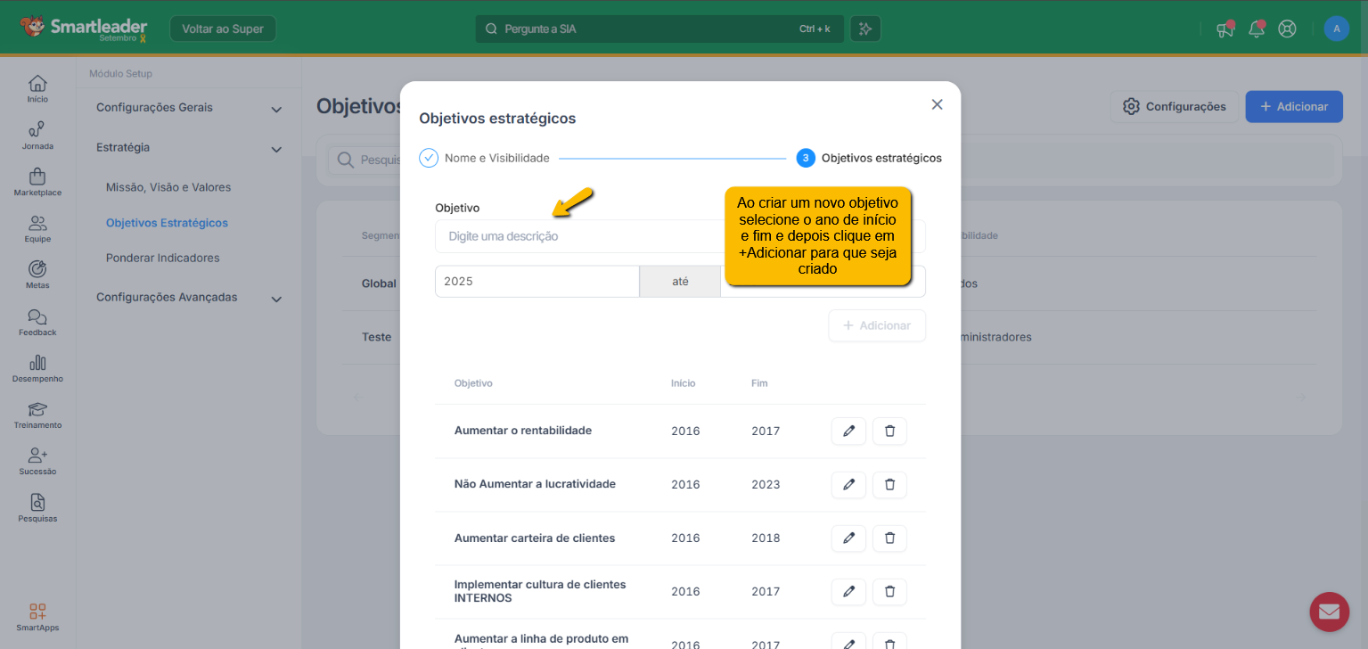 - Preencha o Objetivo e escolha o ano correspondente (lembre-se de clicar no '+ Adicionar')