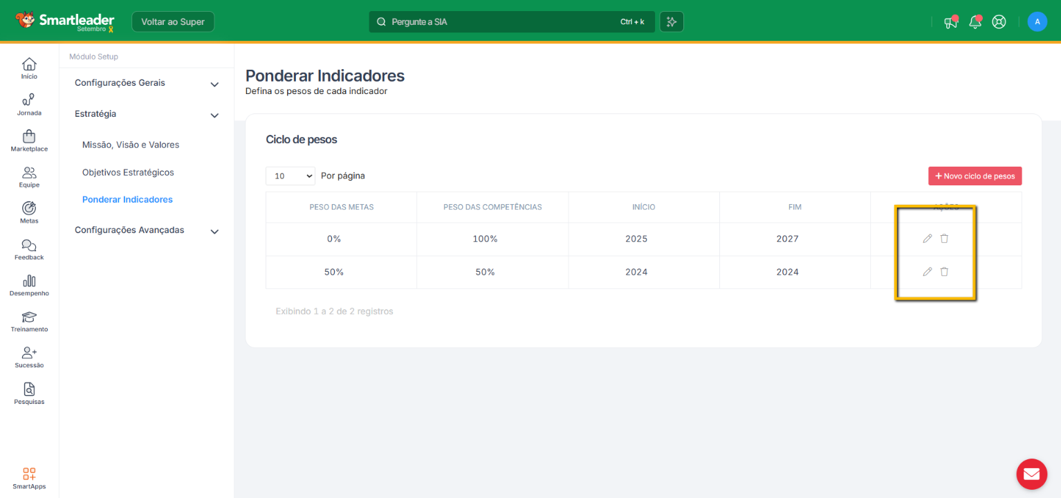 Importante: o Smartleader sempre calcula o resultado do período de acordo com o peso informado no ciclo correspondente. Portanto, caso você tenha mais de um ciclo e seus pesos sejam diferentes, o sistema identificará qual é o peso a ser aplicado sempre que você filtrar um ano específico.