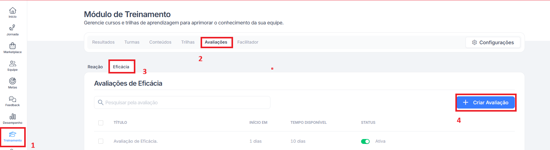 1 - No módulo Treinamento (ícone 1), acesse a aba Avaliações (ícone 2), abra a aba de Eficácia (ícone 3) e na sequência a opção "+Criar Avaliação"(ícone 4):
