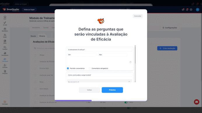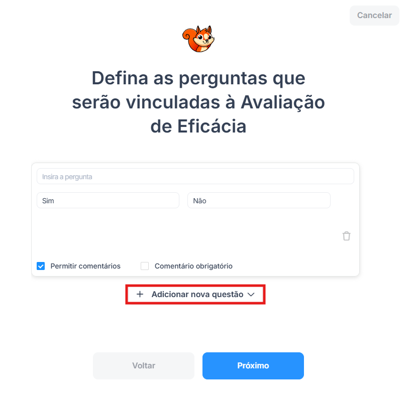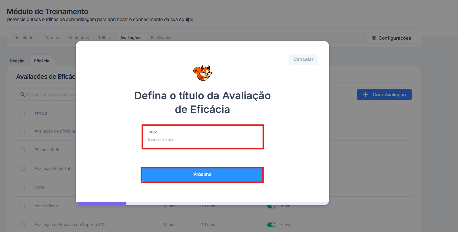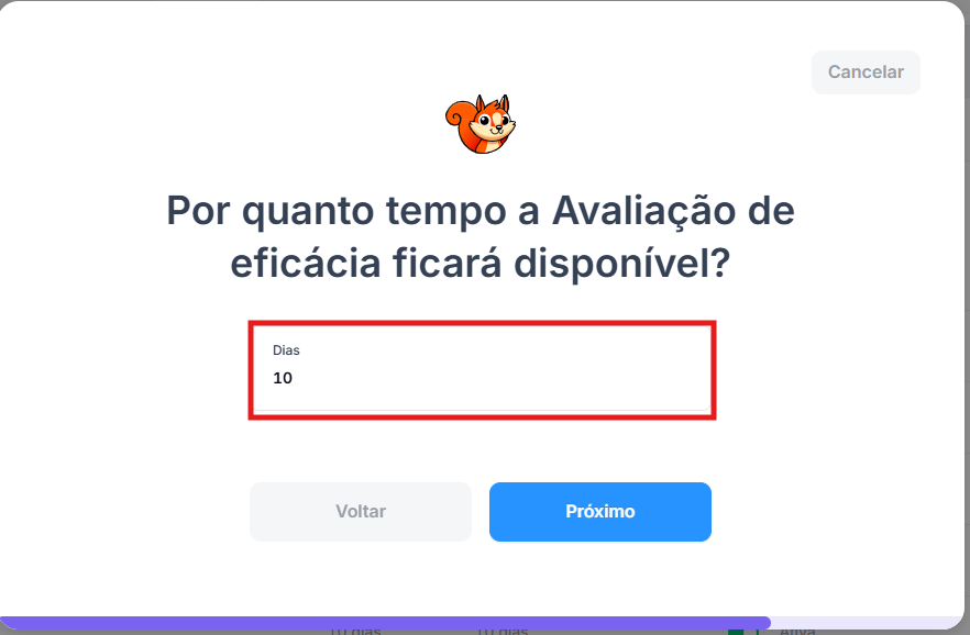 2 - Ao abrir a modal, defina o nome da avaliação de eficácia como deseja e na sequência, próximo: