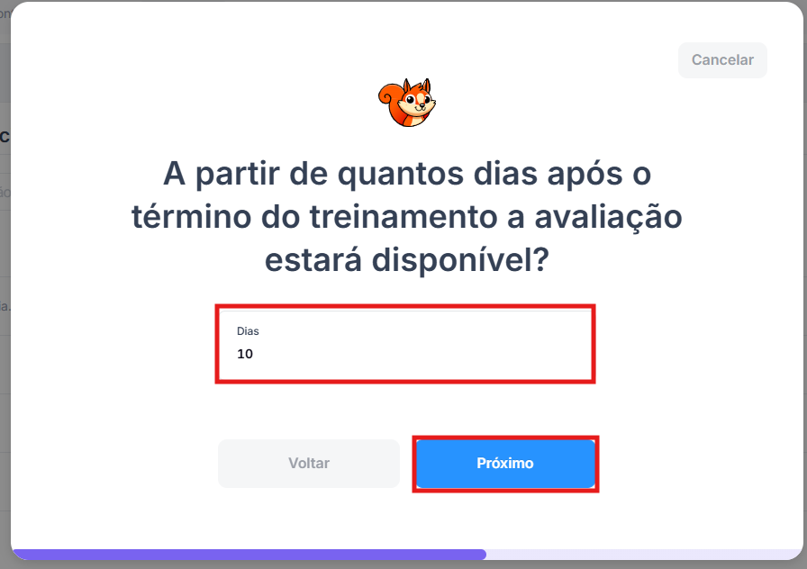 6 - O próximo passo é definir a partir de quantos dias após o término do treinamento a avaliação estará disponível para que o líder daquele colaborador responda. Ex: Um treinamento foi aplicado no dia 01/02 para o colaborador José, 10 dias depois do término, no caso do exemplo, no dia 11/02 a avaliação estará disponível para o líder do José: