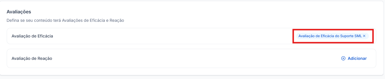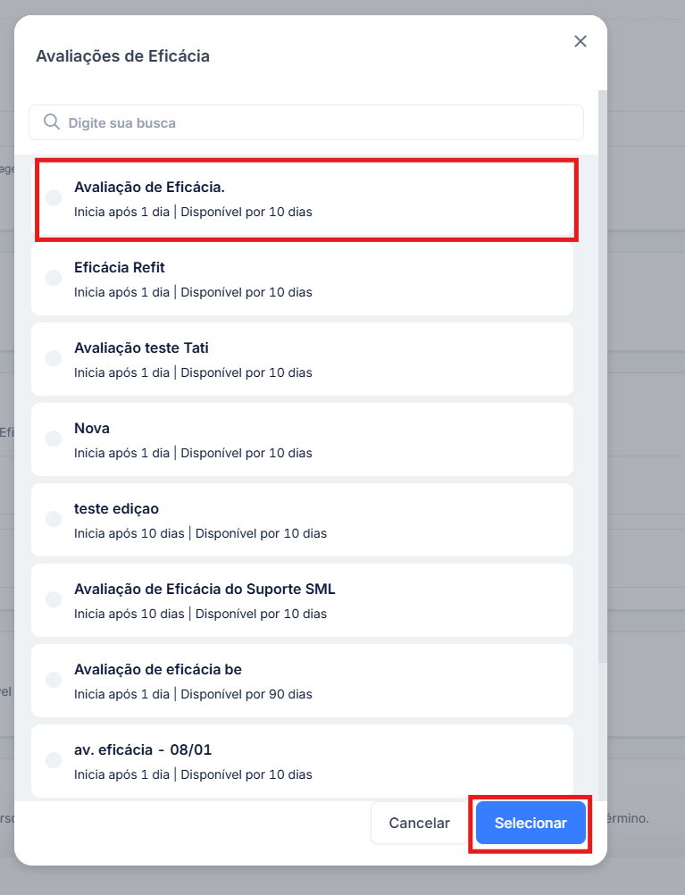 Uma vez que a avaliação foi selecionada, o sistema mostrará o nome da sua avaliação ao lado direito: