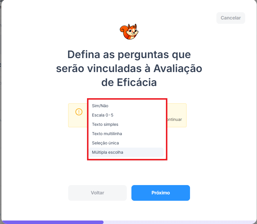 3 - Na sequência, há a modal para selecionar o tipo de pergunta que será aplicada: