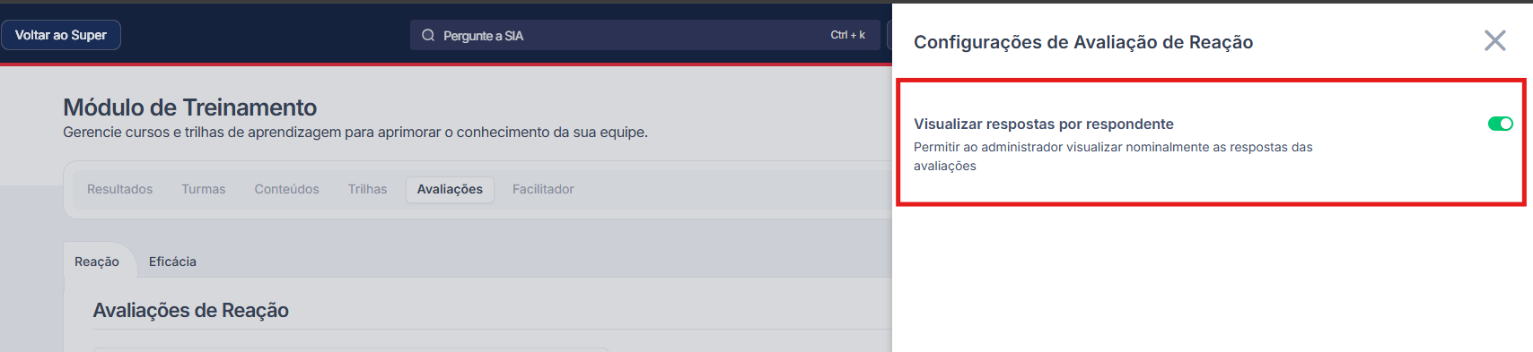 Também é possível definir, que as avaliações de reação sejam nominais, ou seja, com o nome dos respondentes de forma visível: